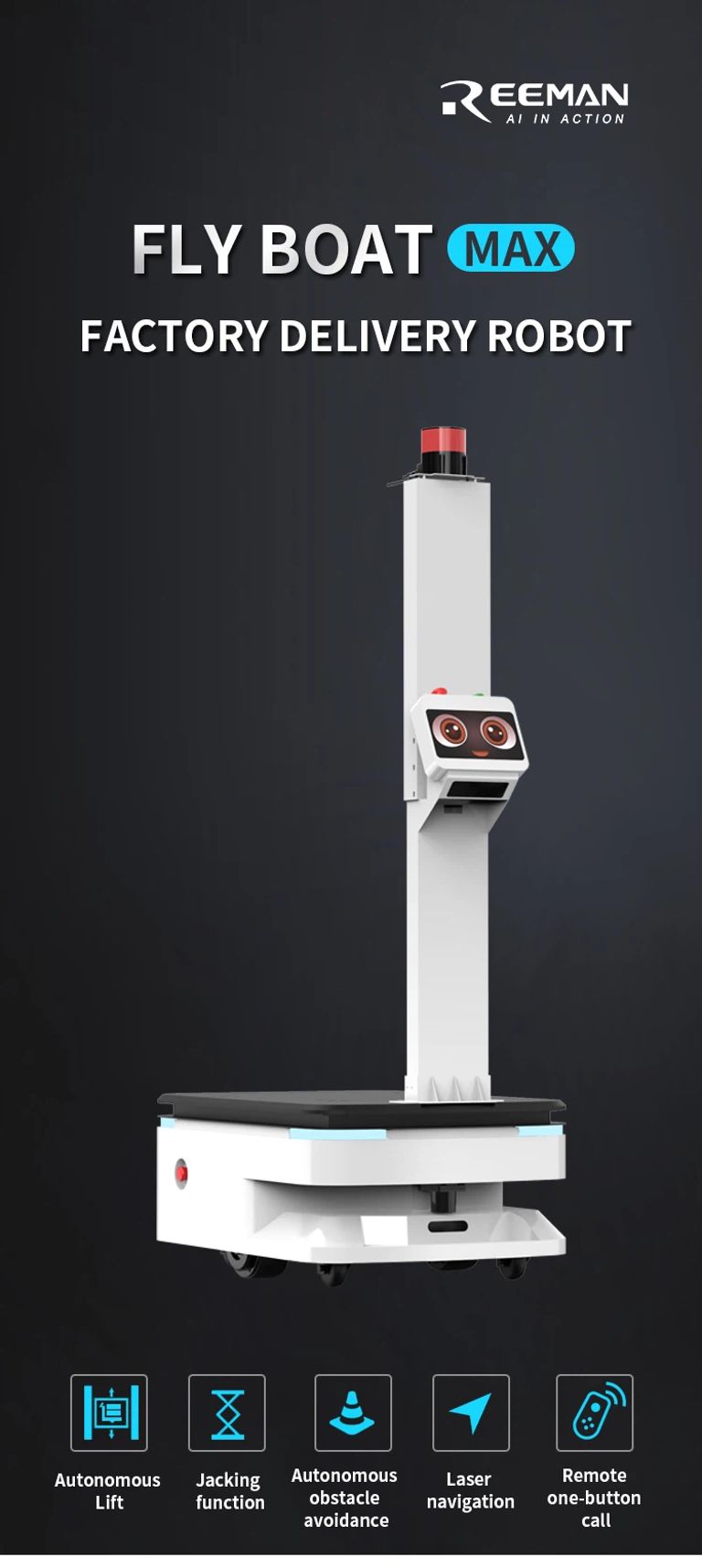 Fly Boat Max je enosmeren robot za upravljanje z nahrbtnikom, ki ima veliko nosilnost 300 kg. Opremljen je z Reeman-ovim samozaznamovalnim sistemom za avtonomno pozicioniranje in navigacijo SLAM 2.0, kar omogoča delovanje brez potrebe po lepljenju kode. Natančna navigacija in pozicioniranje, odprta platforma SDK, bogat API vmesnik ter podpora sekundarnemu razvoju ali prilagodljivim storitvam omogočata različne možnosti za razvoj robotov.