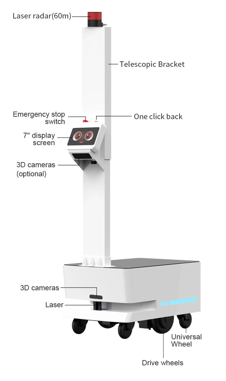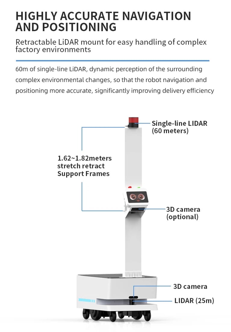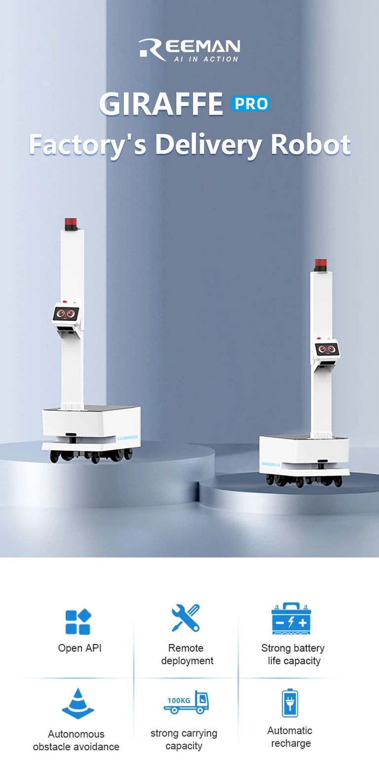 Kot tovarniški dostavni robot Giraffe Pro uporablja LiDAR plus tri sklope tehnologije 3D-kamer za popolno zaznavanje okolice. Okolju je namenjen zvišanju nosilnosti do 100 kg. Opremljen je z Reemanovim avtonomnim sistemom za pozicioniranje SLAM 2.0 in navigacijo, ki ga je razvilo podjetje Reeman in ne zahteva kodiranja ter zagotavlja visoko natančnost. Pozicioniranje, centralni sistem za dispečiranje, sodelovanje več strojev, urejeno delovanje, odprta platforma SDK, ki zagotavlja različne API vmesnike, podpira sekundarni razvoj ali prilagojene storitve za zadovoljevanje različnih potreb razvoja robotov.