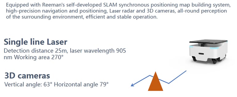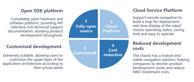 Šasija robota Hussar Pro se ponaša z ogromno nosilnostjo 100 kg, kar omogoča prevoz težkih bremen in učinkovitost v industrijskem okolju. Opremljena je z Reemanovim lastniškim sistemom za avtonomno pozicioniranje in navigacijo SLAM 2.0, ki omogoča enostavno navigacijo skozi različne ozke hodnike v tovarnah, kar je ključno za optimizacijo delovnih procesov in povečanje produktivnosti. S svojim manjšim polmerom obračanja odpravlja potrebo po označevanju poti in ponuja visoko natančno navigacijo ter pozicioniranje, kar skrbi za hitro in zanesljivo premikanje tudi v zapletenih in dinamičnih okoljih. Robot je odprt na platformi SDK, ki ponuja bogat nabor API vmesnikov, kar razvijalcem omogoča enostavno interakcijo z robotom in njegovo prilagoditev njihovim specifičnim potrebam. S tem se lahko podpirajo sekundarni razvoj ali prilagojene storitve, ki izpolnjujejo različne potrebe razvoja robotov, kar pomeni, da je robot Hussar Pro izjemno fleksibilen in prilagodljiv za različne industrijske aplikacije in raziskovalne projekte.