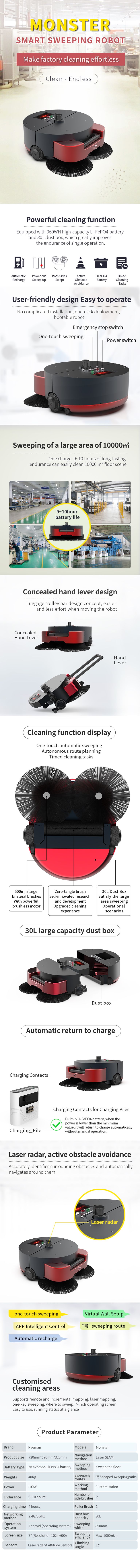 Pametni robot za pometanje Monster ima sposobnost, da s pomočjo laserskega avtonomnega navigacijskega sistema ustvari zemljevid za 30 minut, inteligentno načrtuje pot čiščenja, se v realnem času izogiba oviram, omogoča samodejno polnjenje in obnavlja pometanje na ključnih točkah. Uporabniki lahko preko oddaljenega spremljanja in upravljanja v realnem času spremljajo stanje delovanja robota. Enostavna namestitev robota, nizki stroški vzdrževanja, visoka učinkovitost čiščenja in odlična vzdržljivost zagotavljajo uporabnikom neprimerljivo izkušnjo čiščenja.